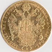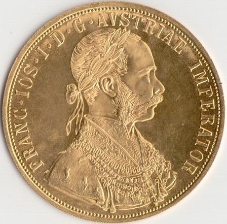 Ebenfalls nachgeprägt wird das österreichische 4-Dukaten-Stück mit entsprechend vierfachem Gewicht und Goldgehalt. Diese Münze mit belorbeertem Brustbild von Franz Joseph I. hat einen Durchmesser von 39,5 mm und ist daher aus empfindlich dünnem Goldblech.